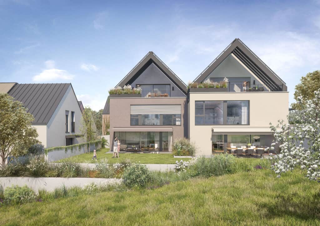 Umgeben sind die Gebäude von einem ebenerdigen Garten mit Sitzplatz, sowie einer Dachterrasse auf dem obersten Geschoss. Für Gartenutensilien und dergleichen verfügt jedes Haus über ein grosszügiges Aussenréduit.